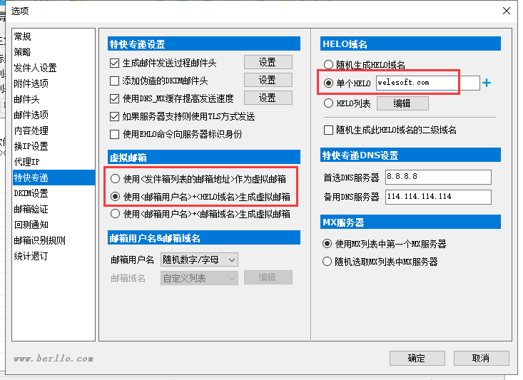 5.在特快专递界面设置好已经做好DKIM解析的域名,发送的时候就会使用DKIM签名来发送邮件,(如果您有多个域名,可以选择:使用<发件箱列表的邮箱地址>作为虚拟邮箱)