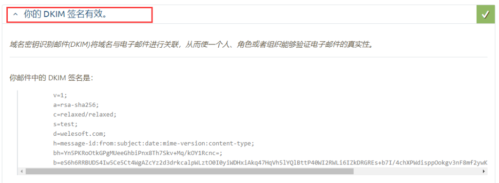 方法2:使用伯勒邮件群发机特快专递模式发给邮件得分测试网站一封邮件 mail-tester.com ,然后查看结果,如果出现你的 DKIM 签名有效。表示DKIM设置已经生效。
