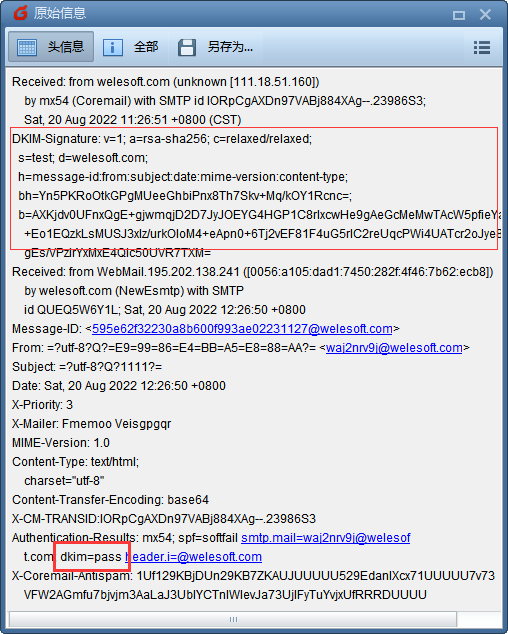 方法1:目前网易163/126/yeah/新浪邮箱是支持签名验证的,所以我们可以使用伯勒邮件群发机特快专递模式发给一封邮件到网易邮箱来验证签名是否生效。如下图邮件原文中显示dkim=pass表示DKIM设置已经生效,如果没有显示dkim=pass,那说明签名没有成功,请检查域名是否已经生效,检查以上步骤是否有设置错误的地方。