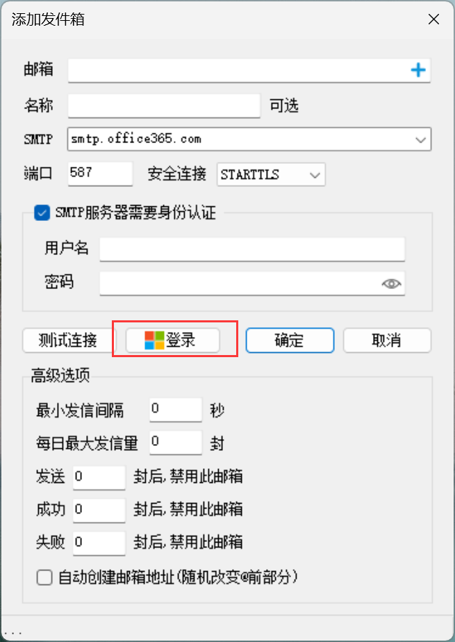 1.在发件箱界面,点击添加按钮或者右键菜单,添加微软邮箱,然后直接点击登录按钮,其他信息在这个界面不用填写和修改