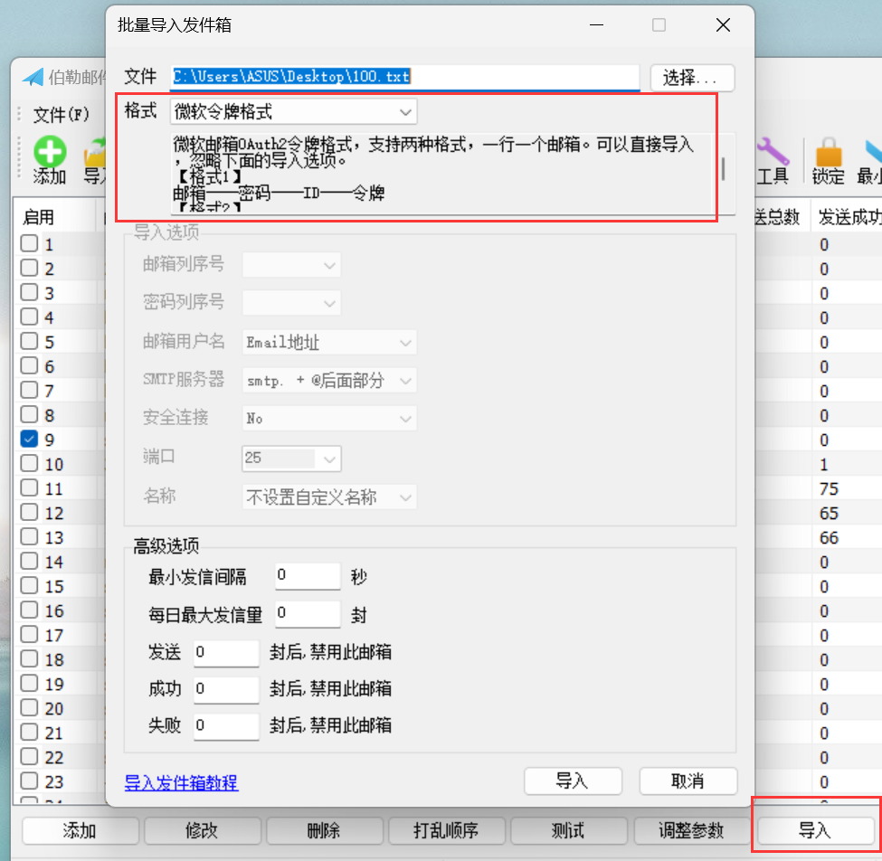 把令牌邮箱放到TXT文件,在发件箱界面点击导入,或者拖入TXT文件到发件箱界面,软件就能自动识别上面两种格式,点击导入即可。