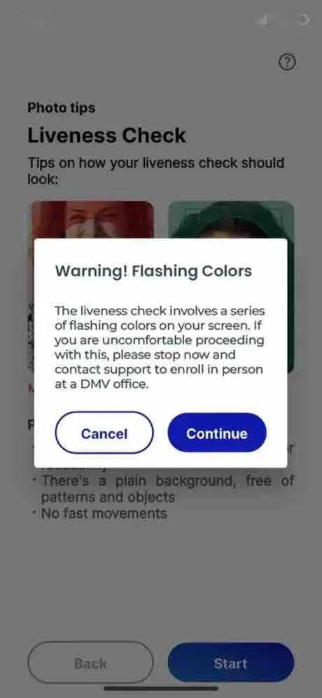 警告:活跃性检查包括屏幕上一系列闪烁的颜色。如果你对此感到不适,请立即停止,并联系工作人员在线下的 DMV 办公室亲自注册。如果这一设置对你没有影响,点击右键“继续”下一步。