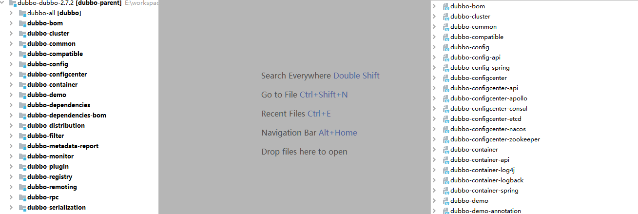 可以看到Dubbo被拆分成很多的Maven项目,在后续课程中会介绍左边每个模块的大致作用。