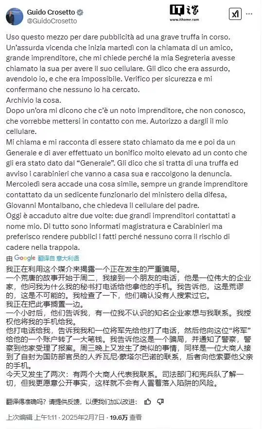 IT之家 2 月 10 日消息,据彭博社报道,近日意大利发生了一起利用人工智能语音工具实施诈骗的事件。诈骗分子伪装成意大利国防部长克罗塞托(Guido Crosetto)及其团队成员,试图说服意大利一些顶级企业家向海外汇款。